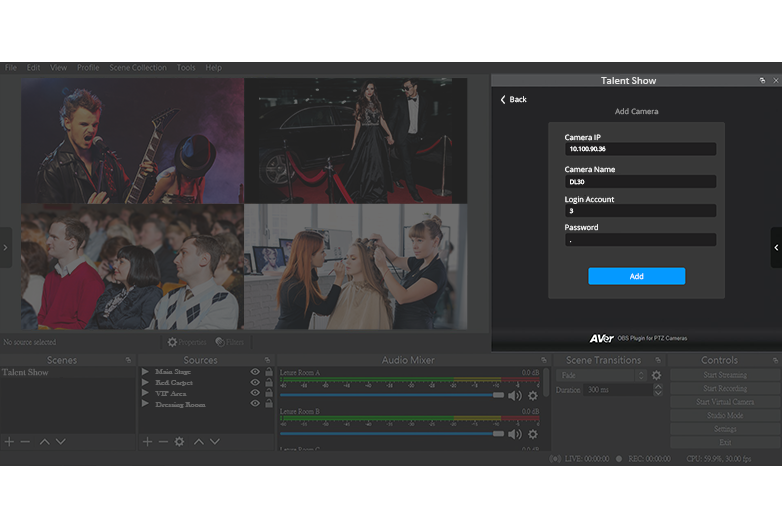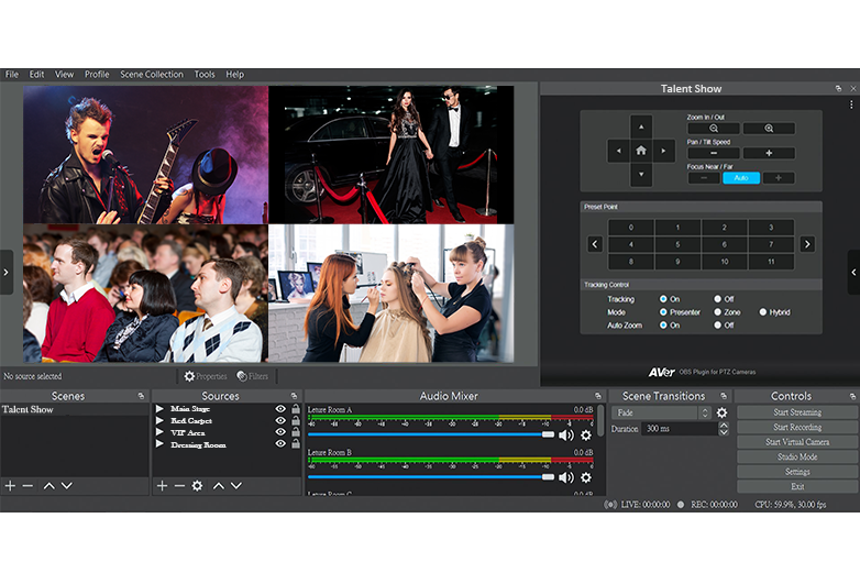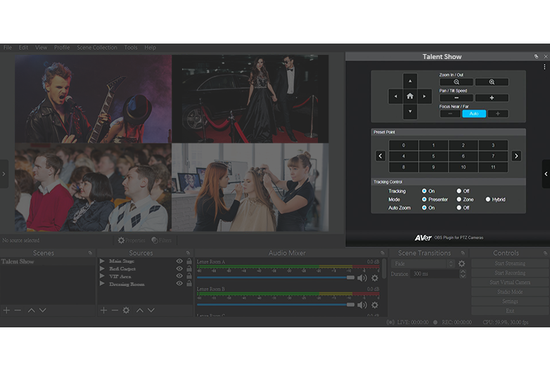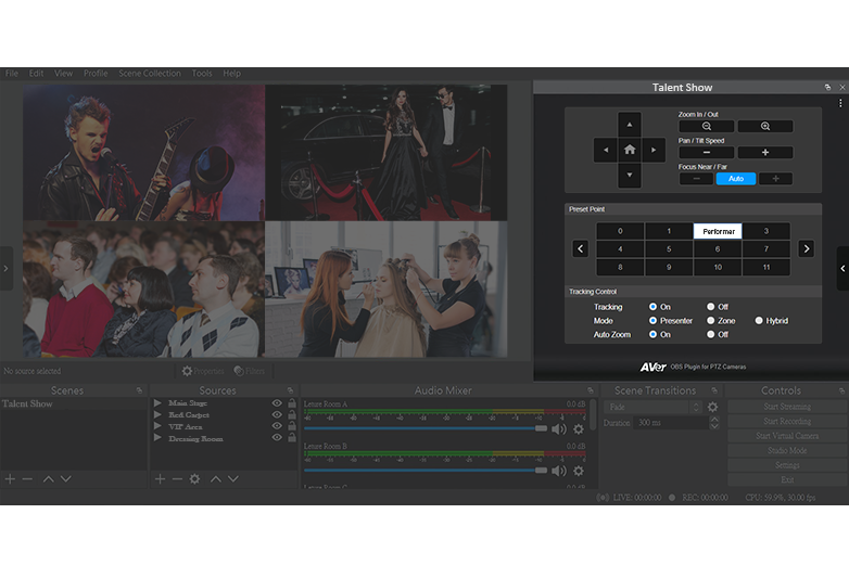 このプラグインは自動追尾機能を含む各カメラ操作をOBS(Open Broadcaster Software)のインターフェースから直接行うためのプラグインです。OBSでの録画または配信時に快適なカメラワークを提供します。